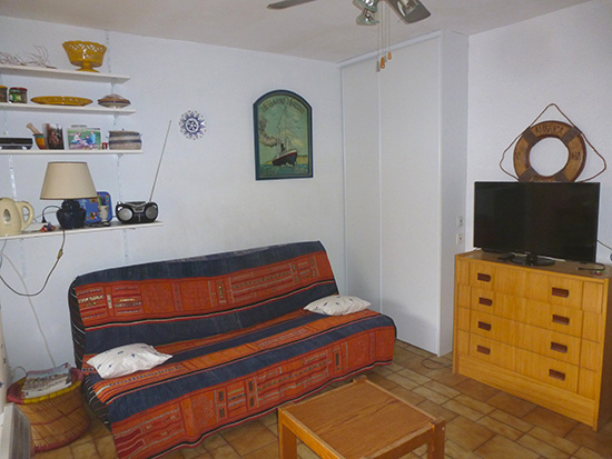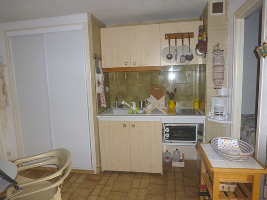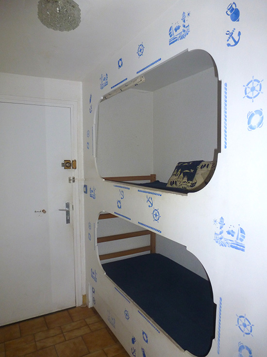 Descriptif du bien : Au 1er étage, D'une résidence sécurisée, AGRÉABLE STUDIO double cabine comprenant : Hall d'entrée avec 2 lits superposés type cabine de bateau, salle d'eau, WC séparés, Séjour avec convertible + Kitchenette équipée,