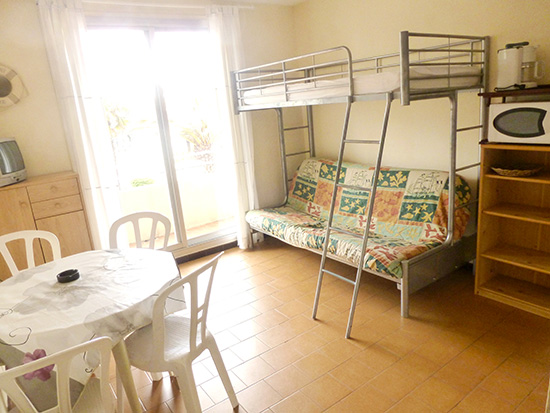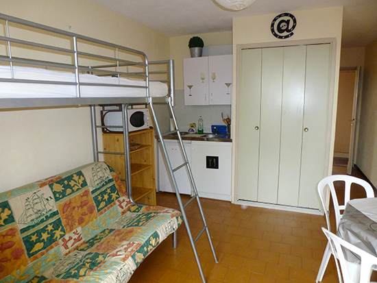 Au 1er étage d’une Résidence Sécurisée, agréable STUDIO 2/3 personnes composé : hall d’entrée, salle d’eau avec WC, séjour avec canapé convertible + Couchette en 90 en partie supérieure, Kitchenette équipée.