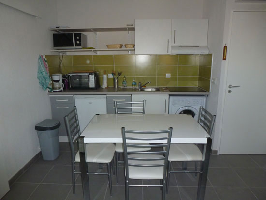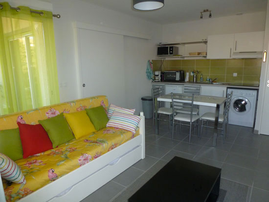 Séjour (avec 2 lits gigognes en 80) + TB cuisine, dégagement, salle d'eau, WC séparés,