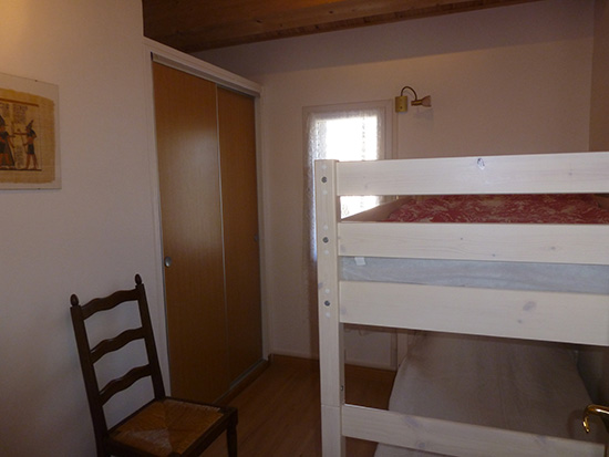 à l 'étage : dégagement, une chambre avec 2 lits superposés en 90 + Placard, une grande chambre